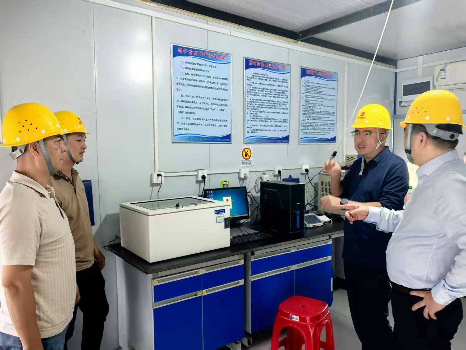 座談會(huì)后,林顯峰董事長一行前往項(xiàng)目多集中拌合站考察建設(shè)情況。在現(xiàn)場(chǎng),領(lǐng)導(dǎo)團(tuán)隊(duì)查看了試驗(yàn)室各個(gè)科室、設(shè)備配置、料倉分區(qū)等,重點(diǎn)詢問了原材料進(jìn)場(chǎng)檢驗(yàn)流程、生產(chǎn)效率及環(huán)保措施落實(shí)情況。針對(duì)拌合站建設(shè),林顯峰董事長提出指導(dǎo)意見:要優(yōu)化料源統(tǒng)籌,建立質(zhì)量追溯機(jī)制,確保關(guān)鍵材料性能穩(wěn)定;要強(qiáng)化設(shè)備維護(hù),定期對(duì)設(shè)備進(jìn)行檢修保養(yǎng),避免影響施工進(jìn)度;要推進(jìn)信息化升級(jí),利用智能監(jiān)控系統(tǒng)監(jiān)測(cè)指標(biāo),實(shí)現(xiàn)生產(chǎn)“可視化、可追溯”,保障路面施工質(zhì)量。